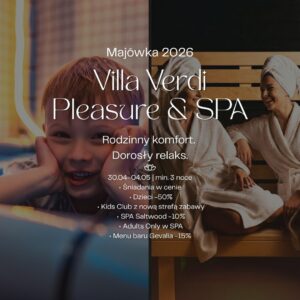 Podgrzewany basen zewnętrzny, wieloosobowe jacuzzi i słoneczny taras w ciepłe dni oraz nowy, kryty basen z atrakcjami wodnymi, brodzikiem dla dzieci i zatoką SPA z jacuzzi w te bardziej kapryśne – da chwile relaksu i odprężenia. Autorskie Saunarium oraz ekologiczne zabiegi jak w hotelu SPA to uczta dla zmysłów i ciała, więc jeśli szukasz hotelu blisko morza z atrakcjami dla dzieci, wybierz Villa Verdi – Łeba noclegi. Hotel? Nie to willa 🙂